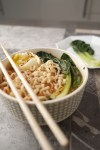 On finit avec les toppings qui nous font plaisir, ici le pak choi, l’œuf mollet et un peu de flocons de piment